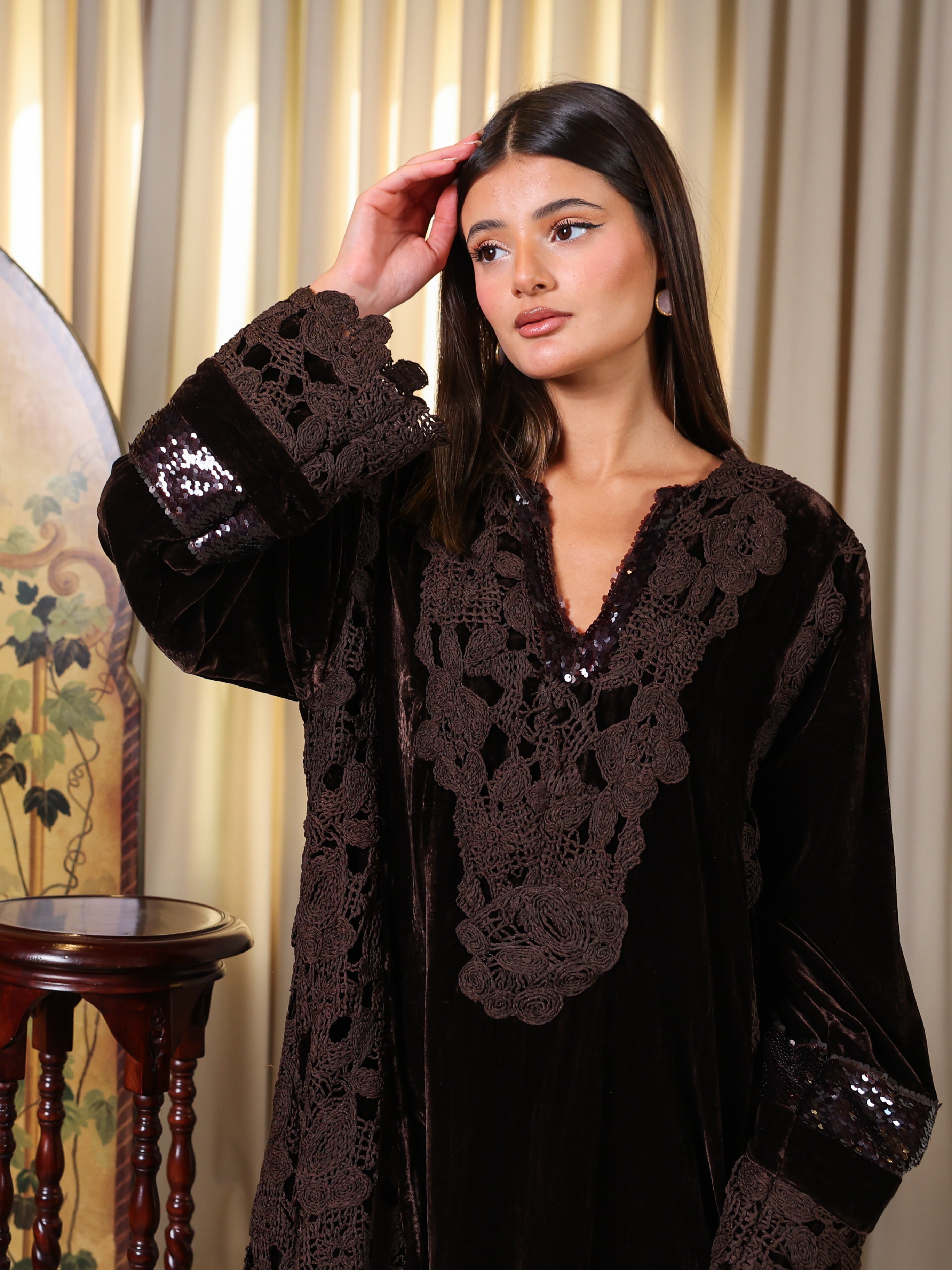 Brown velvet garment, featuring intricate lace detailing on the neckline, sleeves and sides.