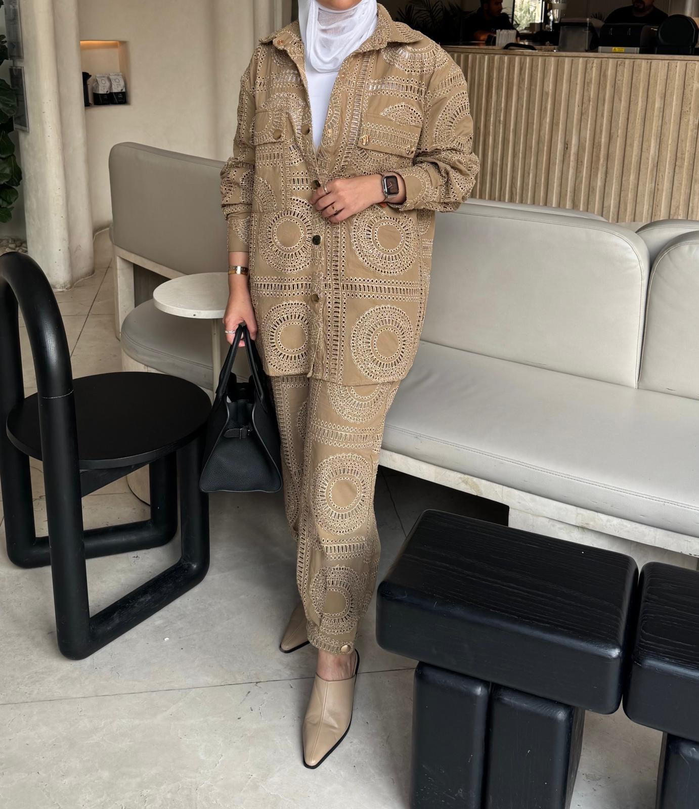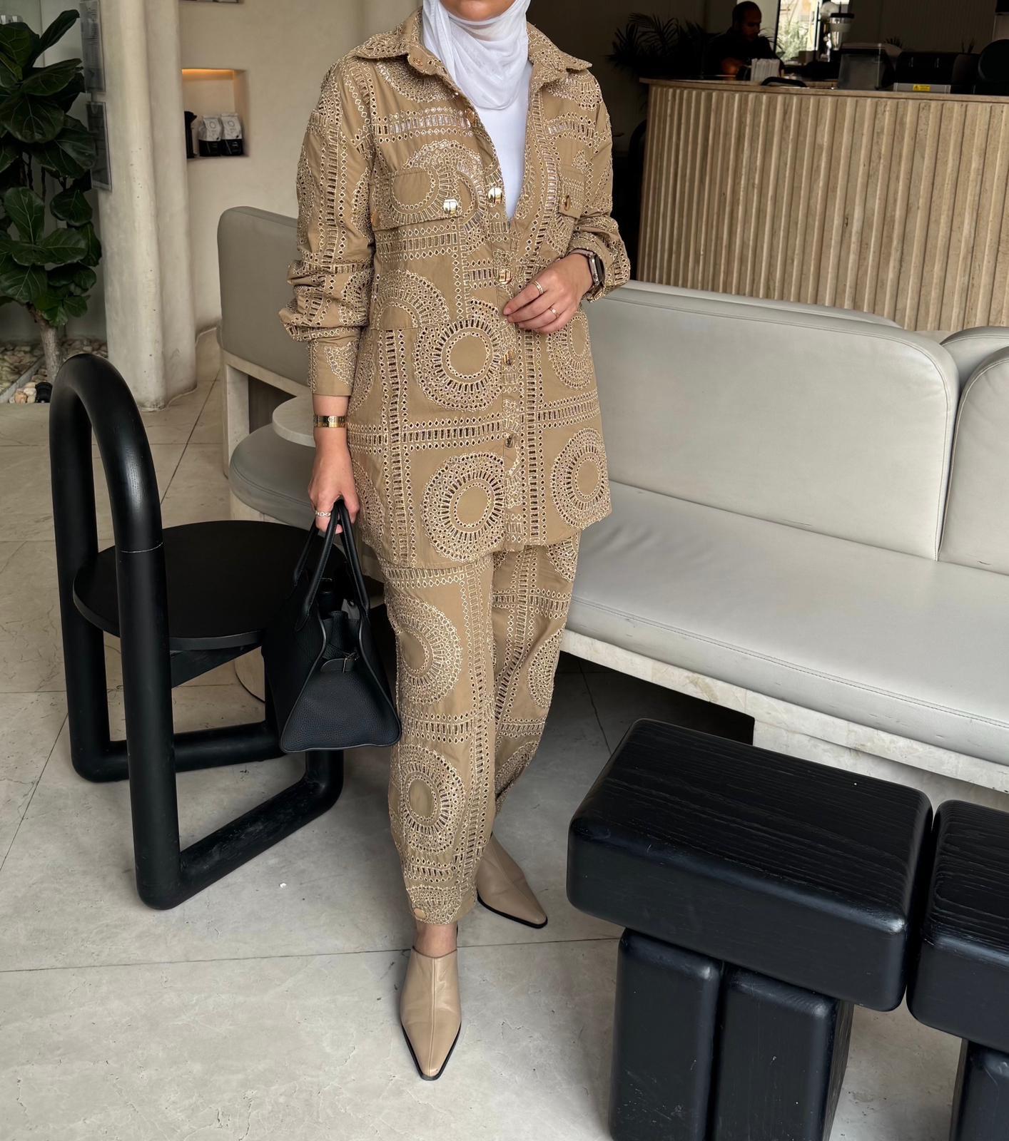 Set includes shirt and trouser with embroidery patter in a distinctive circular motif